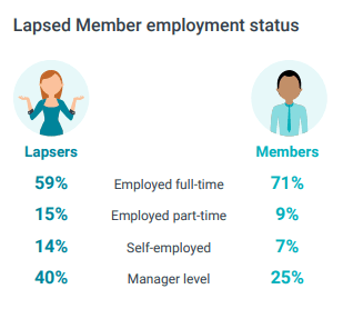 Compared with current members, lapsed members in the study also place significantly higher value on job opportunities and help with career advancement.